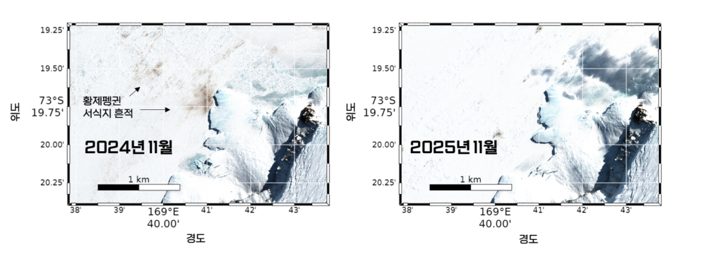 Comparison of the emperor penguin habitat on Coulman Island in November 2024–25.